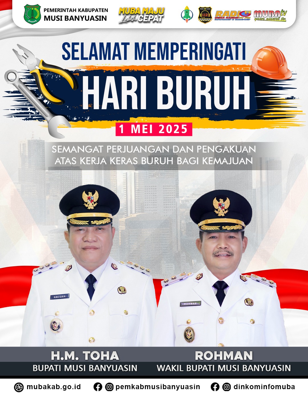 Sekayu // harianmusi.com Di momen peringatan Hari Buruh atau May Day 2025, Bupati Musi Banyuasin, H M Toha dan Wakil Bupati Kyai Rohman, mengucapkan selamat dan memberikan apresiasi tinggi kepada seluruh buruh dan pekerja, khususnya di Kabupaten Musi Banyuasin. Beliau menekankan bahwa buruh merupakan penggerak utama pembangunan daerah.