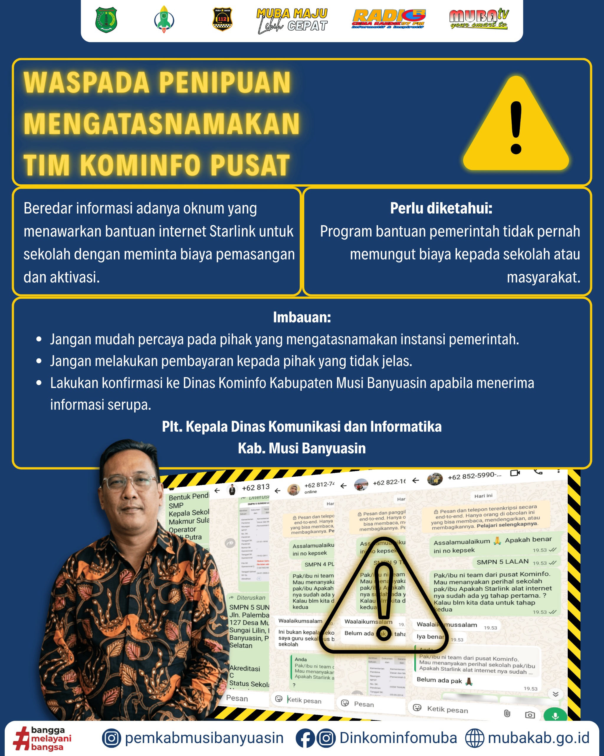SEKAYU // harianmusi.com Pemerintah Kabupaten Musi Banyuasin melalui Dinas Komunikasi dan Informatika (Kominfo) mengimbau masyarakat, khususnya pihak sekolah untuk meningkatkan kewaspadaan terhadap modus penipuan yang mengatasnamakan tim dari Kementerian Komunikasi dan Digital Republik Indonesia terkait pemberian bantuan perangkat internet satelit Starlink.