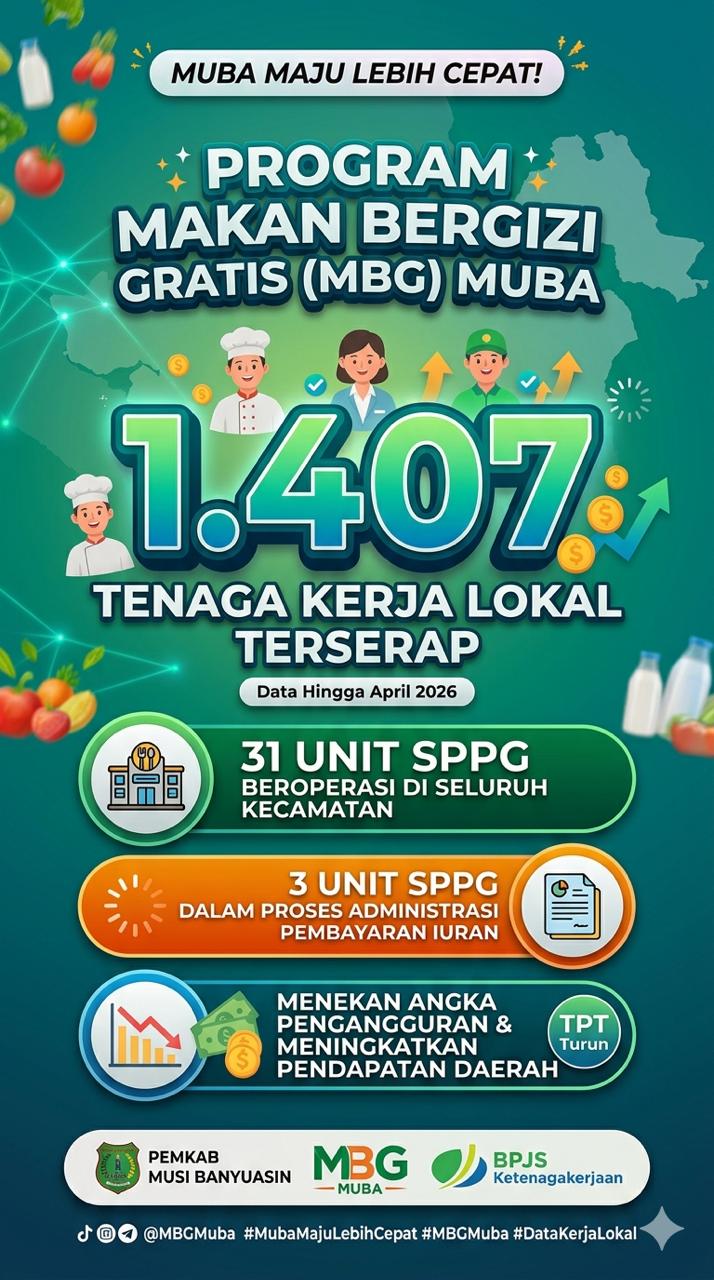 SEKAYU – Kebijakan strategis Pemerintah Kabupaten Musi Banyuasin dalam mengimplementasikan program Makan Bergizi Gratis (MBG) terbukti menjadi solusi nyata dalam memperluas kesempatan kerja. Hingga April 2026, tercatat sebanyak 1.407 tenaga kerja baru telah resmi diberdayakan untuk mengisi posisi operasional di puluhan titik layanan masyarakat di Musi Banyuasin.